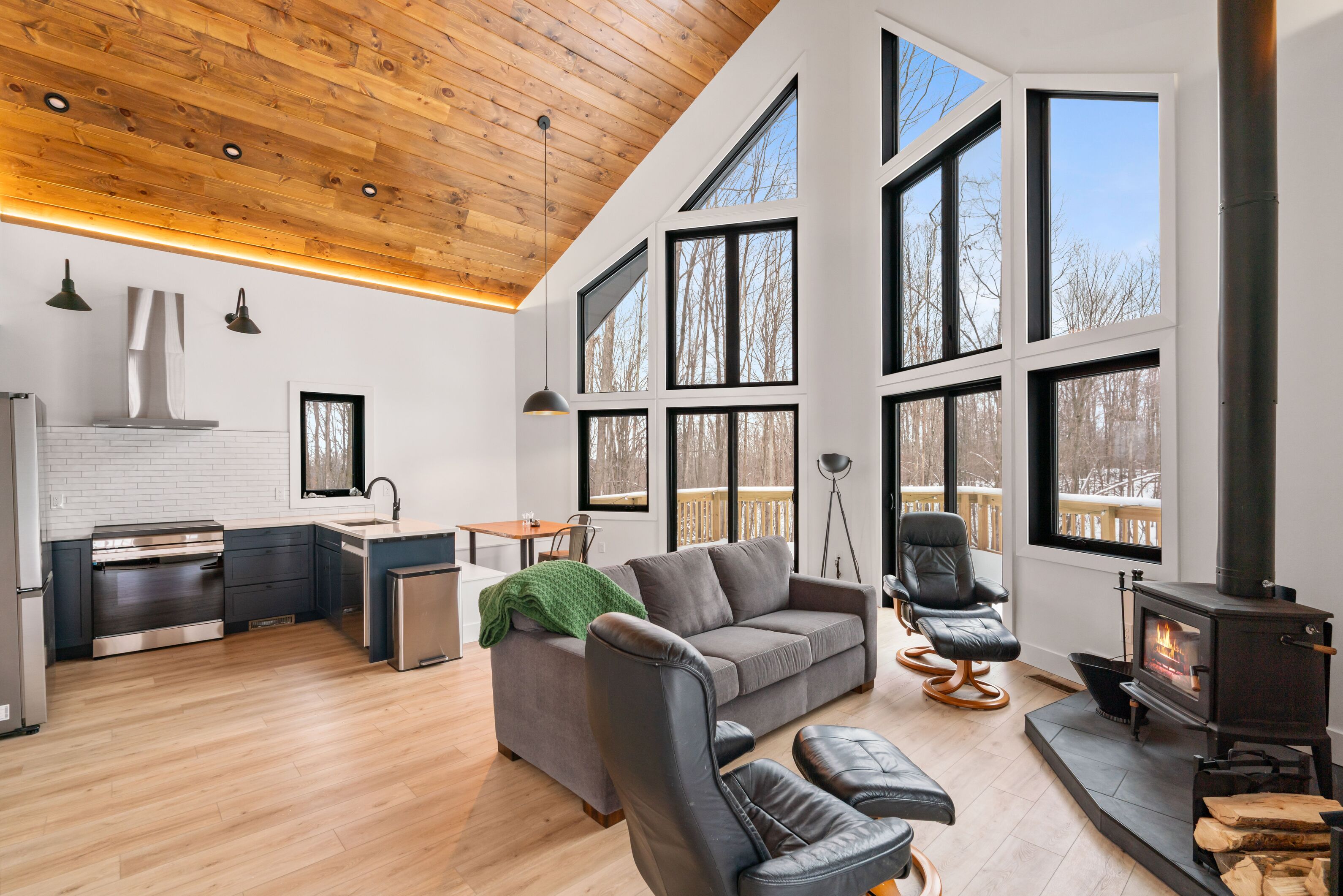 Custom A-frame new construction nestled into the woods outside of Petoskey, MI. Vaulted ceilings, expansive windows, and a cozy wood stove make this home a cozy year-round Northern Michigan retreat.